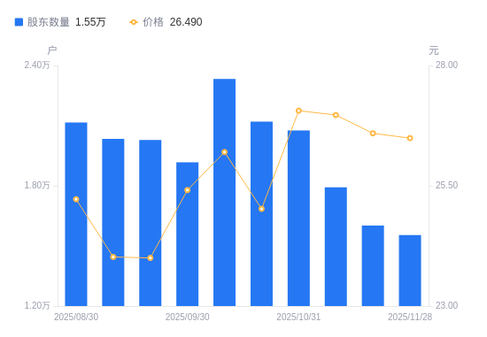 近一年(2024年11月29日至2025年11月28日),壶化股份A股股东户数从9383户,增加至1.55万户,增幅65.63%,区间股价上涨22.07%。