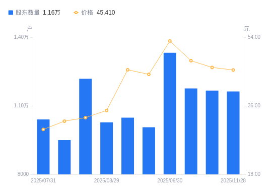 近一年(2024年12月20日至2025年11月28日),宏盛股份A股股东户数从9166户,增加至1.16万户,增幅26.86%,区间股价上涨144.40%。