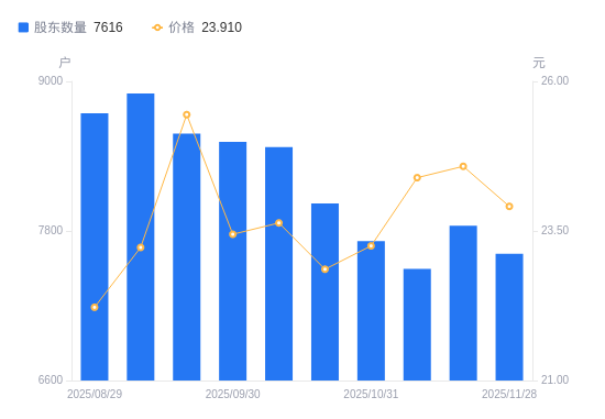 近一年(2024年12月31日至2025年11月28日),开润股份A股股东户数从1.07万户,减低至7616户,降幅28.62%,区间股价上涨0.74%。
