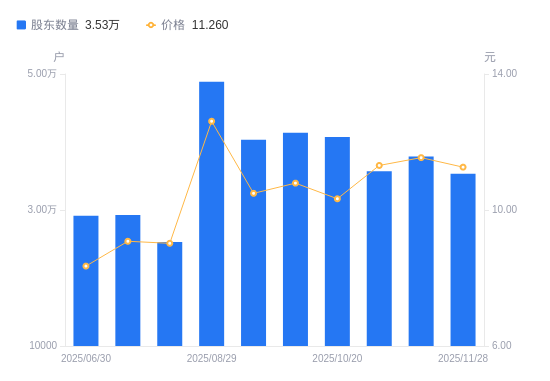 近一年(2024年12月20日至2025年11月28日),翔鹭钨业A股股东户数从2.25万户,增加至3.53万户,增幅57.12%,区间股价上涨62.01%。
