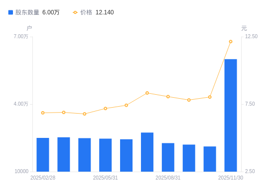 近一年(2024年12月31日至2025年11月30日),中水渔业A股股东户数从2.68万户,增加至6万户,增幅124.07%,区间股价上涨64.72%。