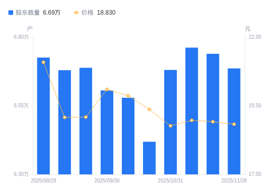 近一年(2024年11月29日至2025年11月28日),航发控制A股股东户数从5.61万户,增加至6.69万户,增幅19.24%,区间股价下跌12.49%。