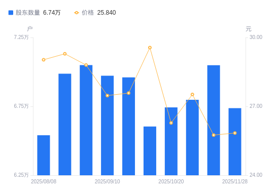 12月2日消息,数据显示,截至2025年11月28日,新大陆A股股东总户数为6.74万户,较上期(2025年11月10日)减少3118户,降幅4.42%。公司最新A股总股本为10.13亿股,其中流通A股10.07亿股,户均持有流通A股数量为1.5万股,较上期增加661.46股,增幅4.63%;户均持流通A股市值38.64万元,较上期增加1.84万元,增幅4.99%。