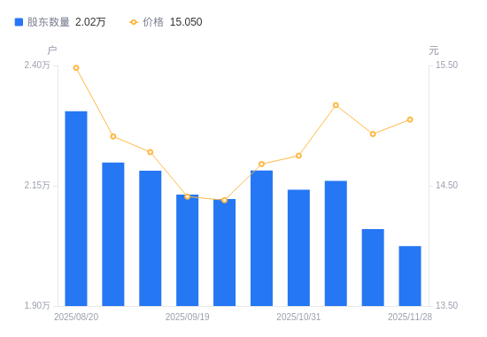 近一年(2024年11月29日至2025年11月28日),桂林三金A股股东户数从1.71万户,增加至2.02万户,增幅18.29%,区间股价上涨6.21%。