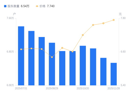 近一年(2024年11月29日至2025年11月28日),海南高速A股股东户数从5.93万户,增加至6.54万户,增幅10.15%,区间股价上涨19.81%。
