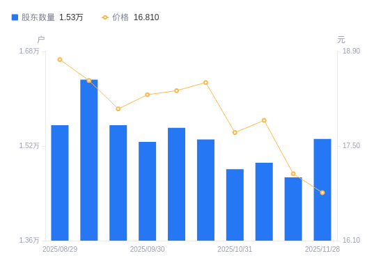 近一年(2024年11月29日至2025年11月28日),双象股份A股股东户数从1.67万户,减低至1.53万户,降幅8.27%,区间股价上涨7.89%。