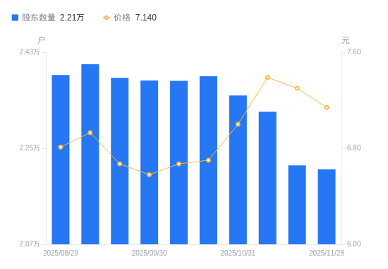 12月1日消息,数据显示,截至2025年11月28日,天禾股份A股股东总户数为2.21万户,较上期(2025年11月20日)减少72户,降幅0.32%。公司最新A股总股本为3.48亿股,其中流通A股3.44亿股,户均持有流通A股数量为1.55万股,较上期增加50.47股,增幅0.33%;户均持流通A股市值11.1万元,较上期减少2119.19元,降幅1.87%。