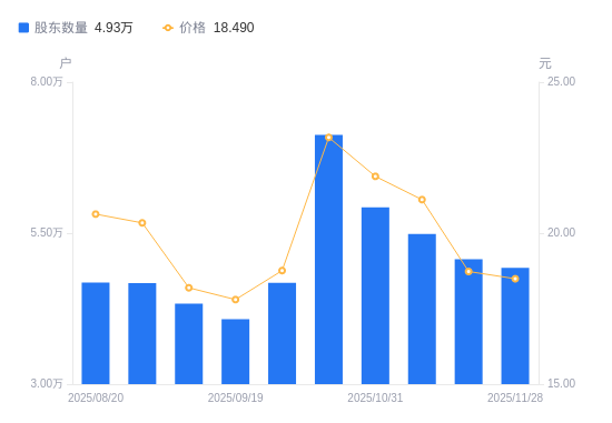 近一年(2024年12月31日至2025年11月28日),中洲特材A股股东户数从1.38万户,增加至4.93万户,增幅257.43%,区间股价上涨181.22%。