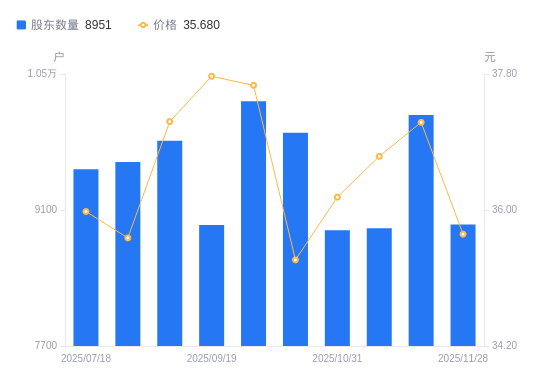 近一年(2024年12月31日至2025年11月28日),辰奕智能A股股东户数从9807户,减低至8951户,降幅8.73%,区间股价下跌7.84%。