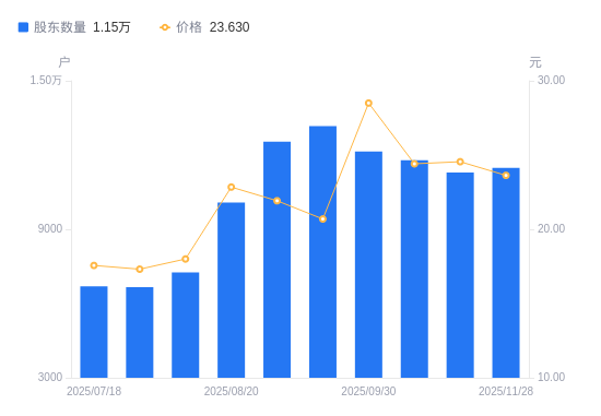 近一年(2024年11月29日至2025年11月28日),松原安全A股股东户数从6122户,增加至1.15万户,增幅87.52%,区间股价上涨59.21%。