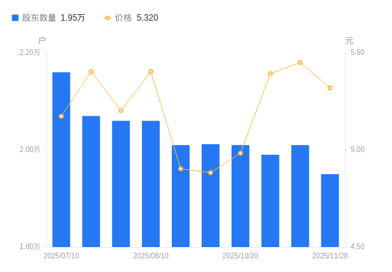 近一年(2024年11月29日至2025年11月28日),永清环保A股股东户数从2.24万户,减低至1.95万户,降幅12.95%,区间股价下跌2.62%。