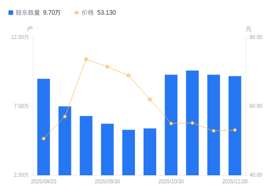 近一年(2024年11月29日至2025年11月28日),科华数据A股股东户数从5.7万户,增加至9.7万户,增幅70.18%,区间股价上涨130.40%。