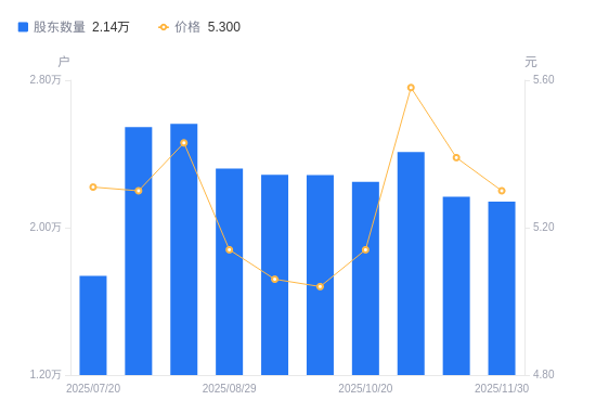 近一年(2024年11月30日至2025年11月30日),同德化工A股股东户数从1.88万户,增加至2.14万户,增幅13.87%,区间股价下跌5.36%。