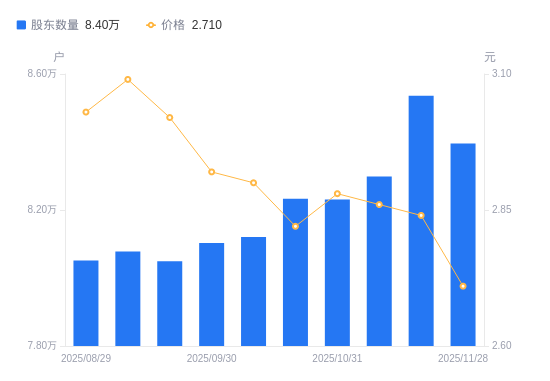 近一年(2024年11月30日至2025年11月28日),天邦食品A股股东户数从7.71万户,增加至8.4万户,增幅8.94%,区间股价下跌17.38%。