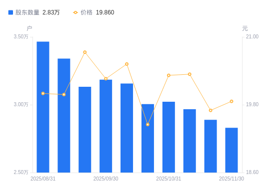近一年(2024年11月30日至2025年11月30日),美亚光电A股股东户数从3.14万户,减低至2.83万户,降幅9.90%,区间股价上涨41.35%。