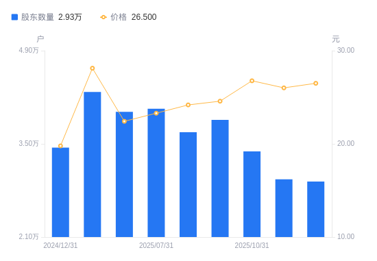 近一年(2024年12月31日至2025年11月28日),利通电子A股股东户数从3.44万户,减低至2.93万户,降幅14.80%,区间股价上涨25.23%。