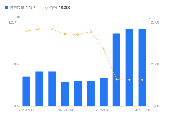 近一年(2024年12月10日至2025年11月30日),邦基科技A股股东户数从1.04万户,增加至1.15万户,增幅11.42%,区间股价上涨61.23%。