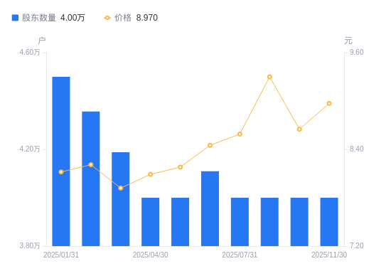 近一年(2024年11月30日至2025年11月30日),徐家汇A股股东户数从4.96万户,减低至4万户,降幅19.35%,区间股价下跌10.66%。