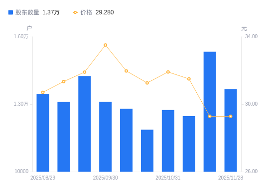 近一年(2024年11月29日至2025年11月28日),洁美科技A股股东户数从1.64万户,减低至1.37万户,降幅16.93%,区间股价上涨45.79%。