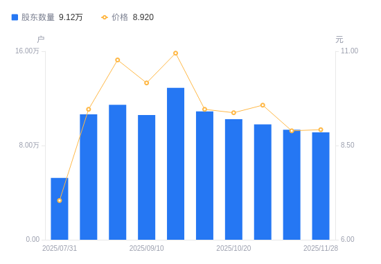 近一年(2024年11月29日至2025年11月28日),北纬科技A股股东户数从4.42万户,增加至9.12万户,增幅106.33%,区间股价上涨39.72%。