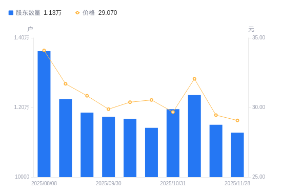 近一年(2024年11月29日至2025年11月28日),大宏立A股股东户数从1.18万户,减低至1.13万户,降幅4.36%,区间股价上涨3.16%。