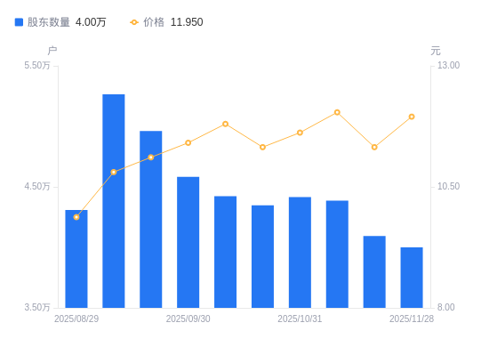 近一年(2024年11月29日至2025年11月28日),金智科技A股股东户数从4.56万户,减低至4万户,降幅12.27%,区间股价上涨26.79%。