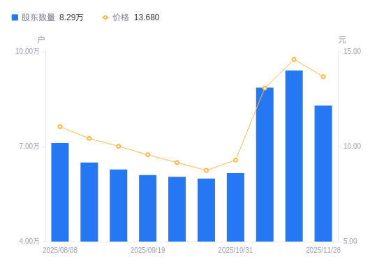 近一年(2024年11月29日至2025年11月28日),东岳硅材A股股东户数从5.92万户,增加至8.29万户,增幅40.15%,区间股价上涨64.92%。