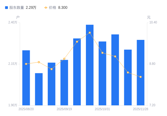 近一年(2024年11月29日至2025年11月28日),中辰股份A股股东户数从2.11万户,增加至2.29万户,增幅8.72%,区间股价上涨17.90%。