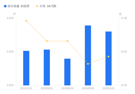 近一年(2024年12月31日至2025年10月31日),川投能源A股股东户数从6.57万户,增加至8.01万户,增幅21.91%,区间股价下跌11.80%。