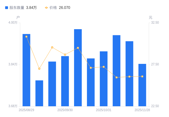 近一年(2024年11月29日至2025年11月28日),电科数字A股股东户数从3.99万户,减低至3.84万户,降幅3.79%,区间股价上涨12.32%。