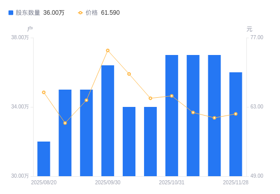 近一年(2024年11月29日至2025年11月28日),浪潮信息A股股东户数从32万户,增加至36万户,增幅12.50%,区间股价上涨30.90%。