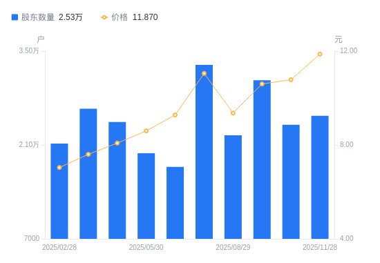 近一年(2024年11月29日至2025年11月28日),金逸影视A股股东户数从2.09万户,增加至2.53万户,增幅21.48%,区间股价上涨57.01%。