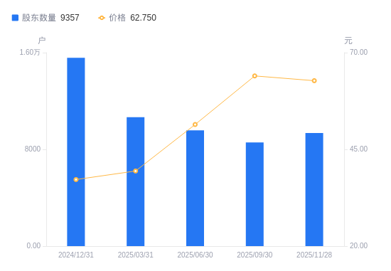 近一年(2024年12月31日至2025年11月28日),绿联科技A股股东户数从1.56万户,减低至9357户,降幅39.92%,区间股价上涨58.66%。