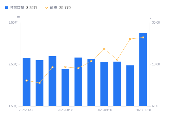 近一年(2024年12月10日至2025年11月28日),新雷能A股股东户数从2.7万户,增加至3.25万户,增幅20.46%,区间股价上涨109.68%。