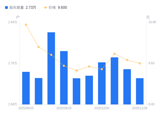 近一年(2024年11月29日至2025年11月28日),克明食品A股股东户数从3.16万户,减低至2.73万户,降幅13.50%,区间股价上涨1.85%。