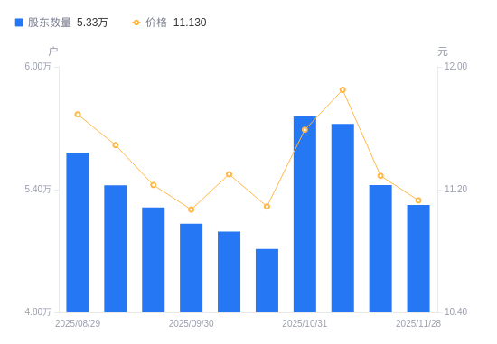 近一年(2024年11月29日至2025年11月28日),青龙管业A股股东户数从5.73万户,减低至5.33万户,降幅7.10%,区间股价下跌8.86%。