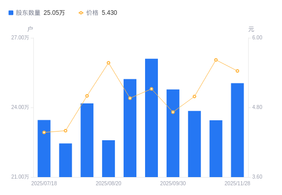 近一年(2024年12月10日至2025年11月28日),华映科技A股股东户数从32.28万户,减低至25.05万户,降幅22.39%,区间股价下跌8.74%。