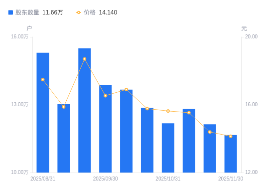 近一年(2024年12月10日至2025年11月30日),川润股份A股股东户数从10.63万户,增加至11.66万户,增幅9.73%,区间股价上涨38.49%。