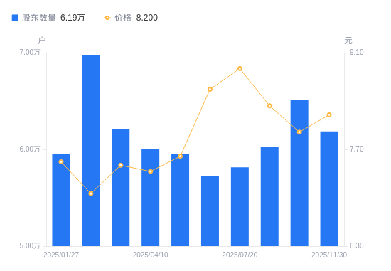 近一年(2024年12月20日至2025年11月30日),苏州银行A股股东户数从5.8万户,增加至6.19万户,增幅6.72%,区间股价上涨9.63%。