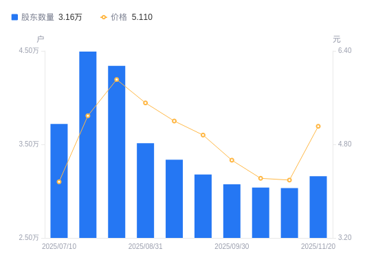 近一年(2024年12月31日至2025年11月20日),*ST立方A股股东户数从3.24万户,减低至3.16万户,降幅2.51%,区间股价上涨11.33%。