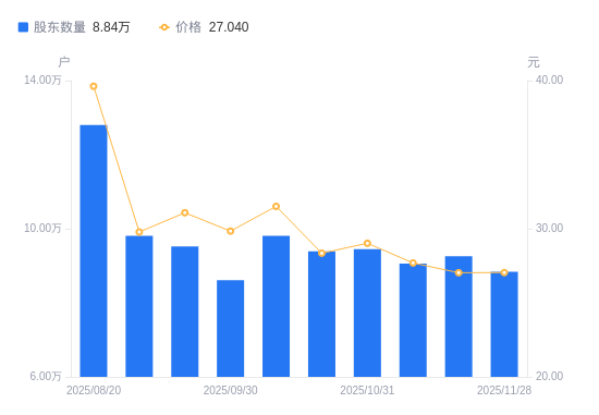 近一年(2024年12月10日至2025年11月28日),建设工业A股股东户数从4.25万户,增加至8.84万户,增幅108.00%,区间股价上涨40.18%。