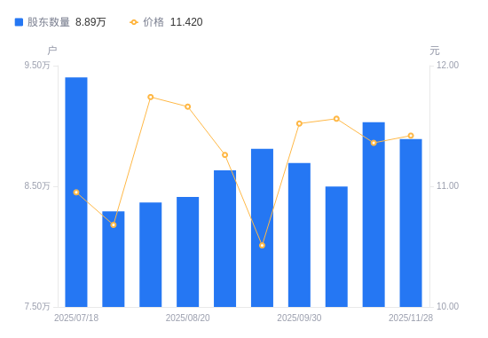 近一年(2024年11月29日至2025年11月28日),千方科技A股股东户数从8.35万户,增加至8.89万户,增幅6.44%,区间股价上涨15.01%。