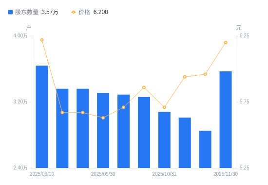 近一年(2024年12月10日至2025年11月30日),明牌珠宝A股股东户数从2.17万户,增加至3.57万户,增幅64.52%,区间股价上涨17.20%。
