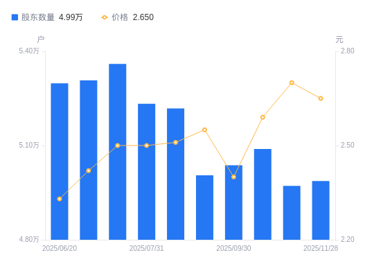 近一年(2024年12月20日至2025年11月28日),华塑股份A股股东户数从5.87万户,减低至4.99万户,降幅14.99%,区间股价下跌8.30%。