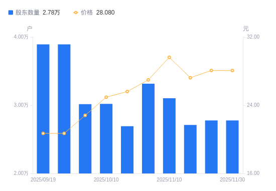 近一年(2024年11月30日至2025年11月30日),星网宇达A股股东户数从4.16万户,减低至2.78万户,降幅33.28%,区间股价上涨22.09%。
