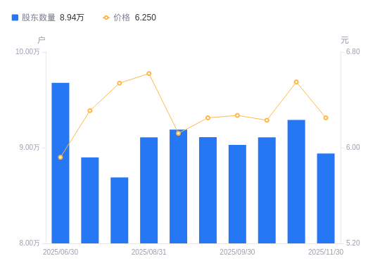 12月8日消息,数据显示,截至2025年11月30日,远光软件A股股东总户数为8.94万户,较上期(2025年11月10日)减少3519户,降幅3.79%。公司最新A股总股本为19.1亿股,其中流通A股17.64亿股,户均持有流通A股数量为1.97万股,较上期增加747.25股,增幅3.94%;户均持流通A股市值12.33万元,较上期减少1024.46元,降幅0.82%。
