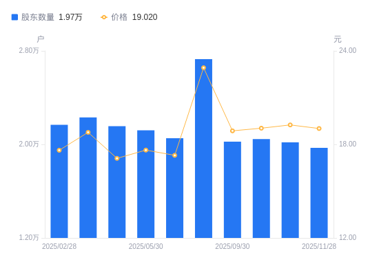 近一年(2024年12月31日至2025年11月28日),天元智能A股股东户数从2.32万户,减低至1.97万户,降幅14.97%,区间股价上涨10.36%。