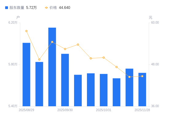 近一年(2024年11月29日至2025年11月28日),高新发展A股股东户数从8.24万户,减低至5.72万户,降幅30.62%,区间股价下跌23.09%。