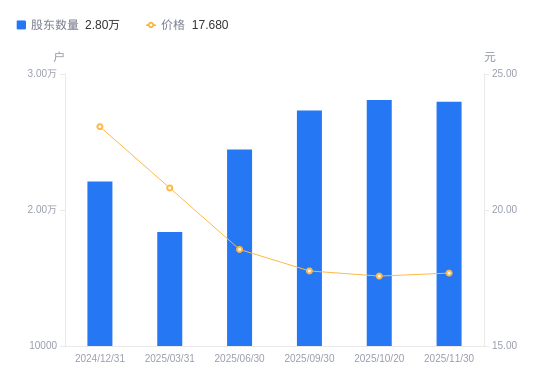 近一年(2024年12月31日至2025年11月30日),大商股份A股股东户数从2.21万户,增加至2.8万户,增幅26.55%,区间股价下跌27.32%。