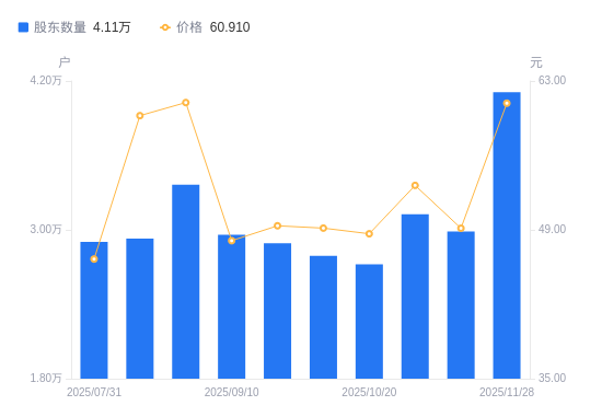 近一年(2024年11月29日至2025年11月28日),中天火箭A股股东户数从2.28万户,增加至4.11万户,增幅80.49%,区间股价上涨45.85%。
